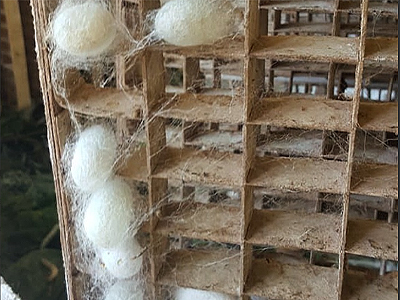 En 2010, su camino dio un vuelco decisivo al descubrir la sericultura. Lo que comenzó como una búsqueda creativa derivó en una formación profunda junto al INTA y el INTI, con quienes colaboró en capacitaciones, proyectos productivos y acompañamiento a productores de diversas provincias. En 2012 se sumergió por completo en este universo al integrarse a la primera unidad productiva de seda de La Pampa en Adolfo Van Praet junto a la familia Cabrera, donde comenzó a criar gusanos y estudiar de primera mano el proceso natural que da origen al capullo.
